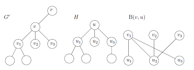这个算法计算了所有的 $u$ 和 $v$ 的 $S(v,u)$ 。我们将展示如何通过从根到叶地遍历 $G^r$ 中的所有节点 $v$ 并计算所有的 $u \in V_H$ $S(v,u)$ ,以此归纳计算 $S(v,u)$ (这个算法也在第三章使用伪代码进行了描述)。这个归纳法的基础是当 $v$ 是 $G^r$ 的叶子节点。 然后 $S(v,u)$ 就可以以下述方法计算所有的 $u$ :如果 $u$ 是 $H$ 的叶子,那么 $S(v,u)$ 就是由一个 $H$ 中只有单邻居的节点 $u$ 所组成的了。否则,如果 $u$ 是一个内部顶点, $S(v,u)$ 为空。